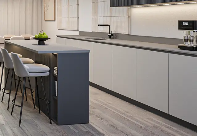 - תוכנית מטבח הכוללת ארונות עליונים ותחתונים ומגרות טריקה שקטה